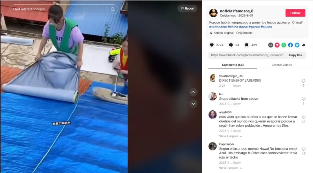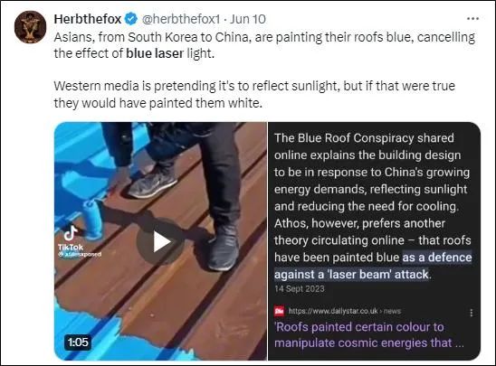 6月10日,一个好意思国会聚博主转发了一段视频称:“中国等国度正在把屋顶弄成蓝色,以此屏蔽激光火器”。